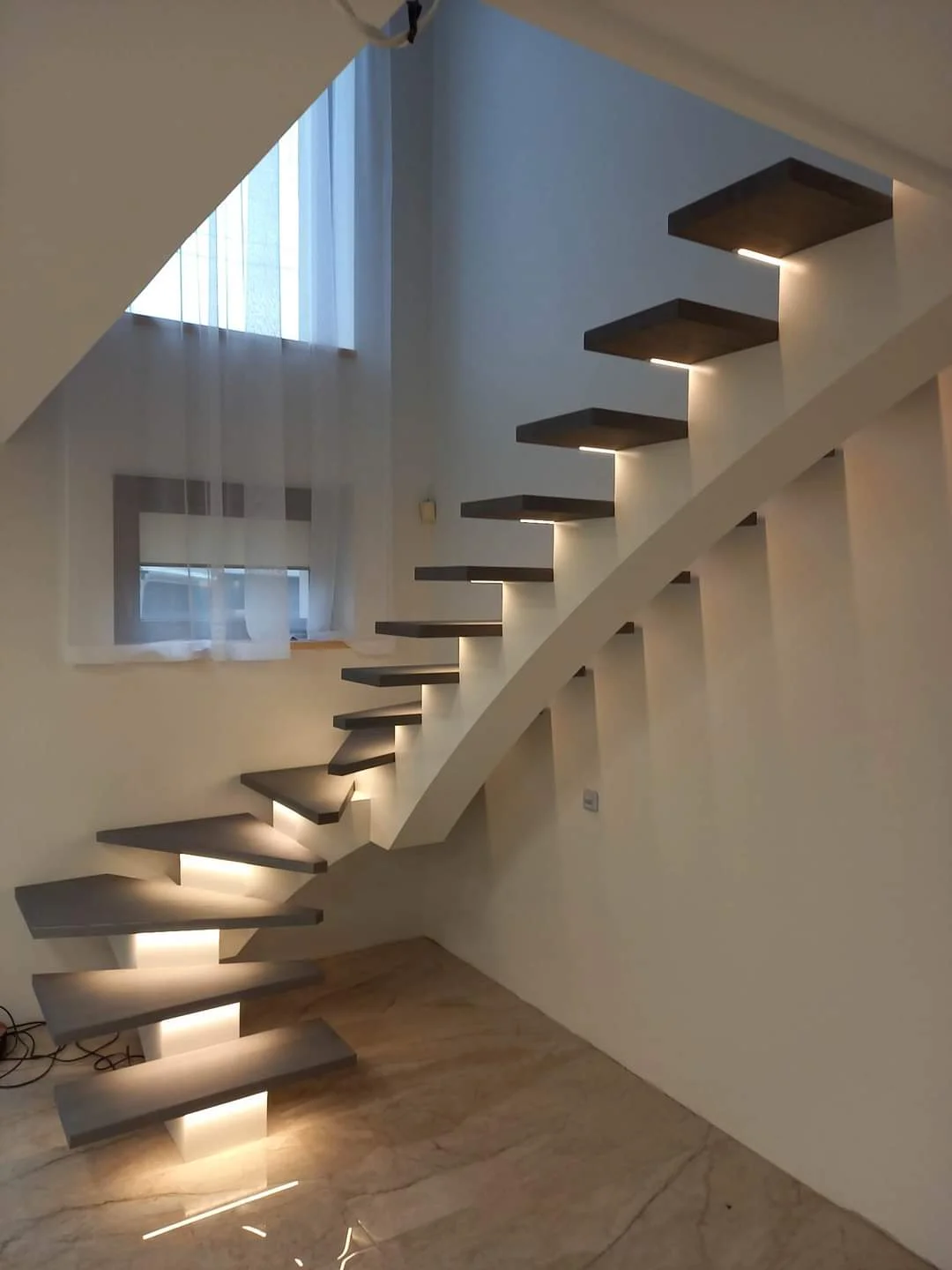 Ant šių konstrukcijų montuojamos natūralios medienos (uosio arba ąžuolo) pakopos, alyvuotos Jūsų pasirinkta spalva. Naudojant „Monocoat“ alyvą galime pritaikyti spalvą prie Jūsų interjero. Taip pat gaminame pakopas iš epoksido, stiklo ar metalo. Įprastas pakopų storis – 2 arba 4 cm. Galimi papildomi sprendimai: LED apšvietimas, „dainuojantys“ laiptai ir kt.